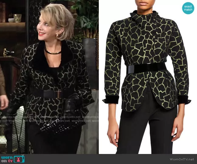 Gloria Abbott Bardwell (played by Judith Chapman) on The Young and the Restless on CBS was spotted wearing this green giraffe pattern jacket on The Young and the Restless on Jan 22 2021's episode. Gloria's Jacket is the Giraffe Print Jacket by Emporio Armani.