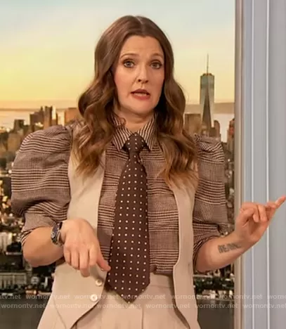 Drew Barrymore on The Drew Barrymore Show on CBS was spotted wearing this check puff sleeve blouse on The Drew Barrymore Show on Jan 25 2021's episode. Drew's Top is the Will Prince Of Wales Check Puff-Sleeve Silk-Blend Blouse by Alice + Olivia . Drew's Pants is the Pleated High-waisted Culottes by Michael Kors Collection.