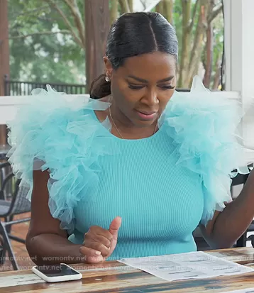 Kenya Moore on The Real Housewives of Atlanta on Bravo was spotted wearing this turquoise ruffle shoulder top on The Real Housewives of Atlanta on episode 'The Jet Set and the Upset' (13x07) in Jan 2021. Kenya's Top is the Combination Knit Top by Zara . Kenya's Bag is the Falabella Toge Bag by Stella McCartney.