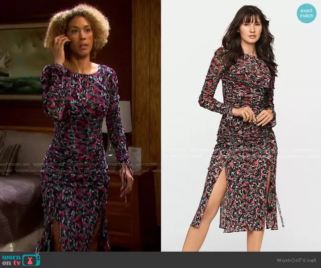 (played by ) on Days of our Lives on Peacock was spotted wearing this Dr. Raynor’s floral ruched midi dress on Days of our Lives on Jan 26 2021's episode. 's Dress is the Corinne Mesh Midi Dress by Diane von Furstenberg.