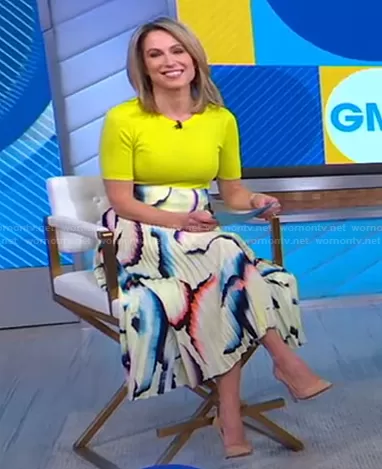Amy Robach on Good Morning America on ABC was spotted wearing this yellow top and abstract print skirt on Good Morning America on Jan 26 2021's episode. Amy's Top is the The Rib Slim T-Shirt by Rag & Bone