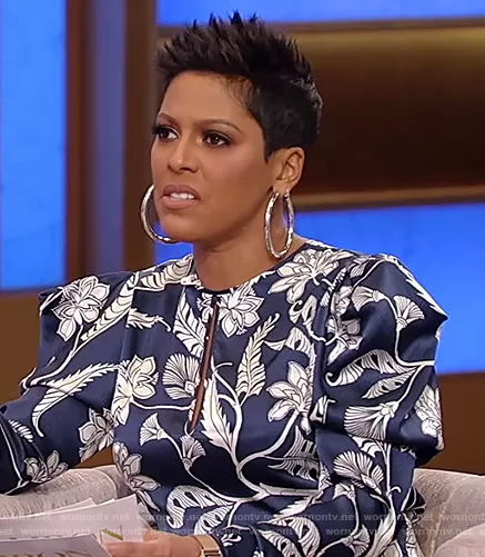 Tamron Hall on Tamron Hall Show on ABC was spotted wearing this blue floral print keyhole dress on Tamron Hall Show on Mar 24 2022's episode. Tamron's Dress is the Wild Blue Wonder Silk Puff-Sleeve Midi Dress by Johanna Ortiz.