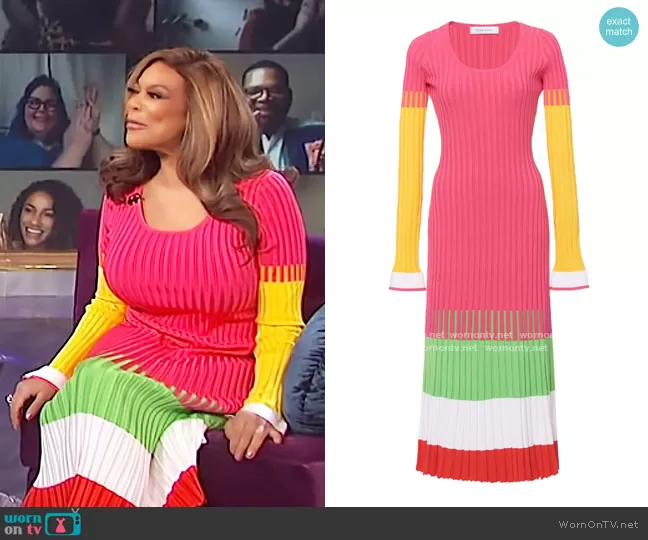 Wendy Williams on The Wendy Williams Show on Various was spotted wearing this ribbed colorblock midi dress on The Wendy Williams Show on Jan 27 2021's episode. Wendy's Dress is the Stripe Ribbed Knit Dress by Prabal Gurung.