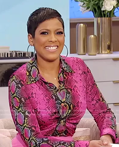Tamron Hall on Tamron Hall Show on ABC was spotted wearing this pink snakeskin ruched blouse on Tamron Hall Show on Jan 27 2021's episode. Tamron's Top is the Ruched snake-print jersey blouse by Versace.