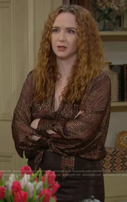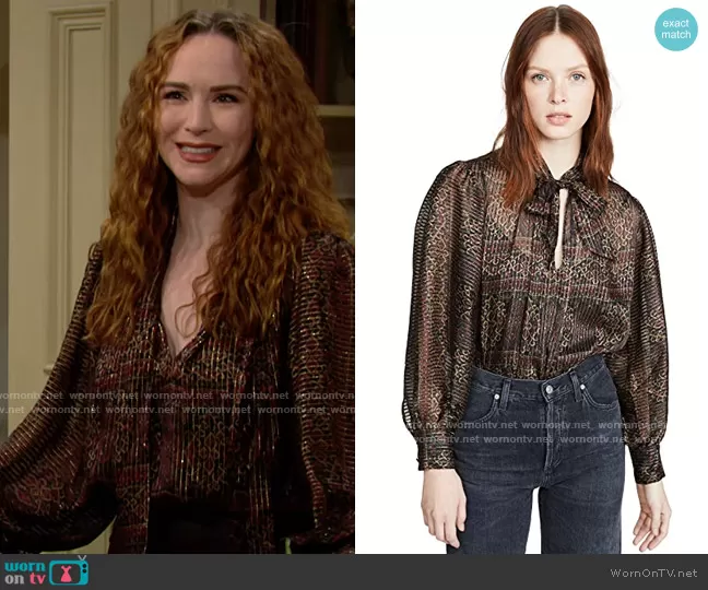 Mariah Copeland (played by Camryn Grimes) on The Young and the Restless on CBS was spotted wearing this printed metallic tie neck blouse on The Young and the Restless on Jan 27 2021's episode. Mariah's Top is the Metallic Keyhole Top by Frame.