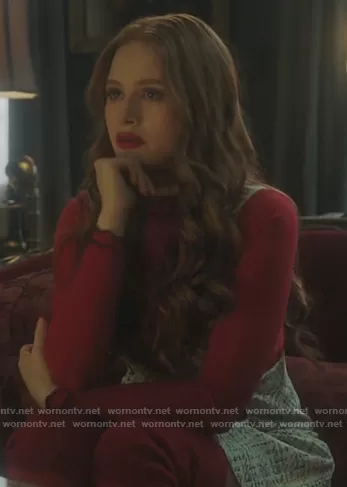 Cheryl Blossom (played by Madelaine Petsch) on Riverdale on The CW was spotted wearing this red zig-zag trim sweater on Riverdale on episode 'The Preppy Murders' (5x02) in Jan 2021. Cheryl's Sweater is the Zig-Zag Knit Top by Proenza Schouler . Cheryl's Dress is the Printed Pinafore Dress with Buttons by Zara.