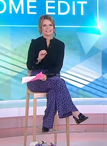 Savannah Guthrie on Today on NBC was spotted wearing this black blouse and leopard print pants on Today on Jan 28 2021's episode. Savannah's Top is the Ruffled Blouse by Co . Savannah's Pants is the Emmanuelle Wide-Leg Pants by Vanessa Seward . Savannah's Shoes is the Block Heel Loafer Pump by Prada.
