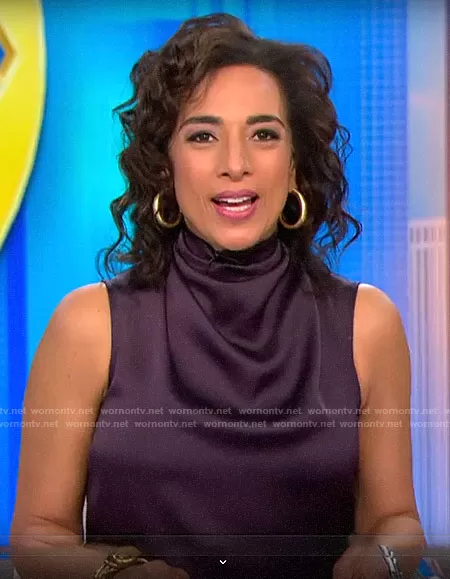 Michelle Miller on CBS Mornings on CBS was spotted wearing this purple sleeveless cowl neck top on CBS This Morning on Jan 28 2021's episode. Michelle's Top is the Sleeveless Cowl Neck Top by Halston.