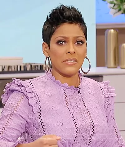 Tamron Hall on Tamron Hall Show on ABC was spotted wearing this lavender floral lace dress on Tamron Hall Show on Jan 28 2021's episode. Tamron's Dress is the Brighton Paneled Cotton-blend Lace Midi Dress by Zimmermann.