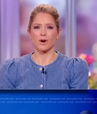 Sara Haines on The View on ABC was spotted wearing this quilted denim jacket on The View on Jan 29 2021's episode. Sara's Jacket is the Camilla Quilted Denim Jacket by Veronica Beard.