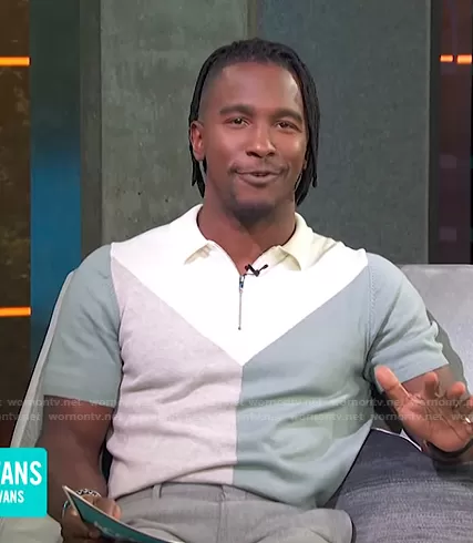 Butler Colorblock Wool Blend Zip Polo in Sage by Reiss worn by Scott Evans on Access Hollywood