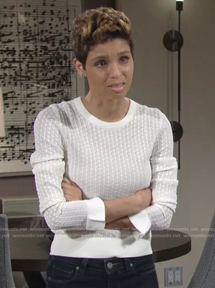 Elena Dawson (played by Brytni Sarpy) on The Young and the Restless on CBS was spotted wearing this white pointelle sweater on The Young and the Restless on Jan 29 2021's episode. Elena's Top is the Crochet Knit Top by MICHAEL Michael Kors.