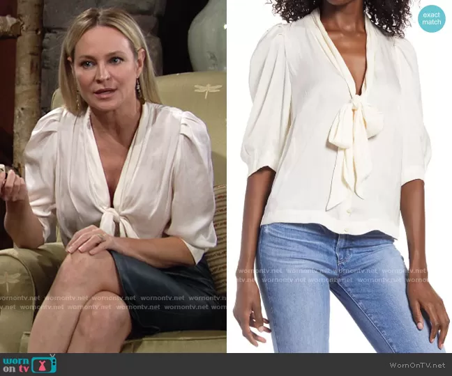 Sharon Newman (played by Sharon Case) on The Young and the Restless on CBS was spotted wearing this white tie-neck blouse on The Young and the Restless on Feb 01 2021's episode. Sharon's Top is the Satin Tie Neck Top by Zadig & Voltaire.