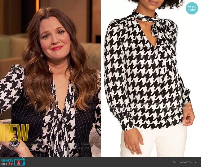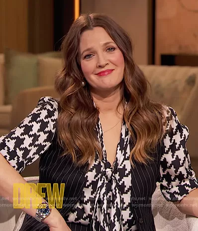 Drew Barrymore on The Drew Barrymore Show on CBS was spotted wearing this houndstooth print tie neck blouse on The Drew Barrymore Show on Feb 01 2021's episode. Drew's Top is the Demming Houndstooth Top by Trina Turk . Drew's Vest is the Striped wool-blend Vest by Dolce and Gabbana . Drew's Pants is the Pinstripe Tapered Trousers by Dolce & Gabbana . Drew's Apron is the Nathalie Lete Helena Apron by Anthropologie.