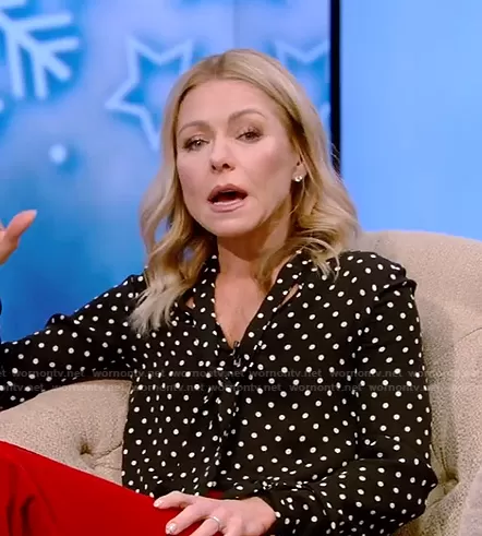 Kelly Ripa on Live with Kelly and Mark on Disney ABC Home Entertainment was spotted wearing this polka dot blouse and flare pants on Live with Kelly and Ryan on Feb 01 2021's episode. Kelly's Top is the Polka Dot Silk Georgette Blouse by Valentino . Kelly's Pants is the Cord Flared Pants by Saint Laurent.