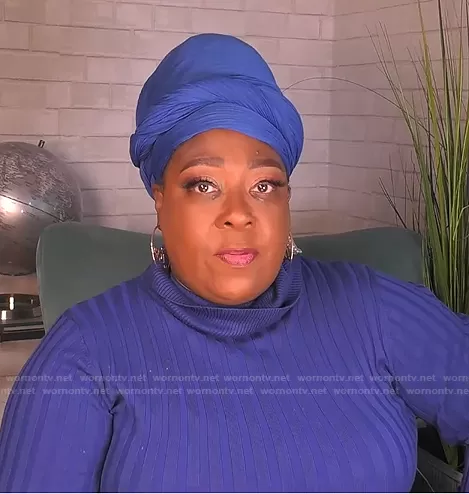 Loni Love on The Real on BETher was spotted wearing this blue ribbed turtleneck sweater on The Real on Feb 01 2021's episode. Loni's Sweater is the Ribbed Knit Turtleneck Sweater by Ashley Stewart.
