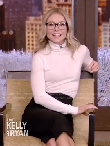 Kelly Ripa on Live with Kelly and Mark on Disney ABC Home Entertainment was spotted wearing this white turtleneck sweater and black skirt on Live with Kelly and Ryan on Mar 30 2021's episode. Kelly's Sweater is the Mulberry Silk Turtleneck by Ralph Lauren . Kelly's Skirt is the Arreton Fitted Pencil Skirt by Roland Mouret.