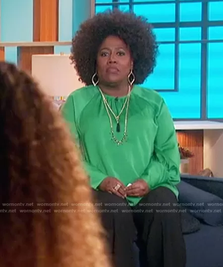 Sheryl Underwood on The Talk on CBS was spotted wearing this green balloon sleeve blouse on The Talk on Feb 02 2021's episode. Sheryl's Top is the Balloon Long Sleeve High Cuff Blouse by Target.