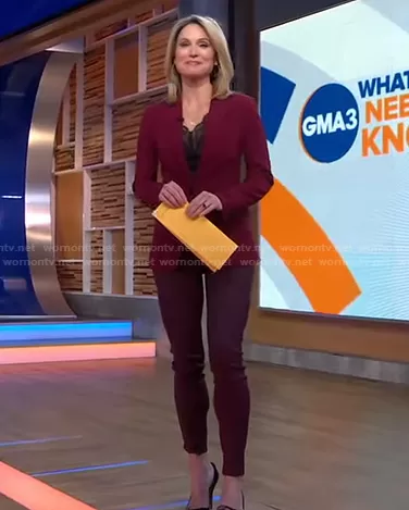 Amy Robach on Good Morning America on ABC was spotted wearing this burgundy blazer and leggings on Good Morning America on Feb 02 2021's episode. Amy's Top is the Silk Lace Top by Intimissimi . Amy's Jacket is the Staple Blazer by Theory . Amy's Leggings is the Faux Leather Pants by Level 99.