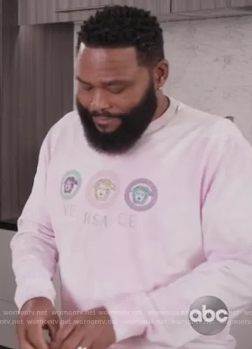 Andre Johnson (played by Anthony Anderson) on Black-ish on ABC was spotted wearing this pink Versace sweatshirt on Black-ish on episode 'What About Gary?' (7x10) in Feb 2021. Andre's Sweater is the Medusa Embroidery Tie-dye Sweatshirt by Versace.