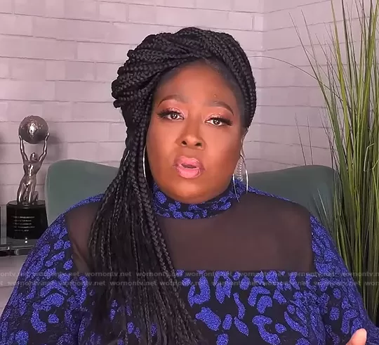 Loni Love on The Real on BETher was spotted wearing this metallic blue leopard mesh top on The Real on Feb 03 2021's episode. Loni's Top is the Lurex Mesh Animal Drama Sleeve Top by Ashley Stewart.