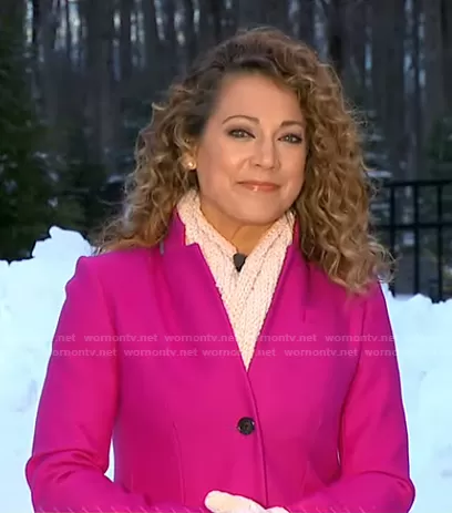 Ginger Zee on Good Morning America on ABC was spotted wearing this pink coat on Good Morning America on Apr 26 2021's episode. Ginger's Coat is the Regent Topcoat by J. Crew.