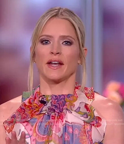 Sara Haines on The View on ABC was spotted wearing this paisley ruffle top on The View on Feb 04 2021's episode. Sara's Top is the The Lovestruck Floral Chiffon Tank by Zimmermann.