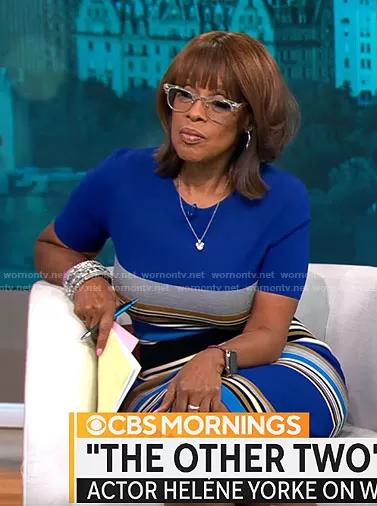 Gayle King on CBS Mornings on CBS was spotted wearing this blue striped dress on CBS This Morning on Apr 28 2023's episode. Gayle's Dress is the Dasha Dress by Diane von Furstenberg .
