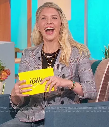 Amanda Kloots on The Talk on CBS was spotted wearing this plaid double breasted blazer on The Talk on Feb 04 2021's episode. Amanda's Blazer is the Empire Plaid Dickey Jacket by Veronica Beard . Amanda's Pants is the Giselle high-rise flared jeans by Veronica Beard . Amanda's Shoes is the Marmont leather loafer pumps by Gucci.