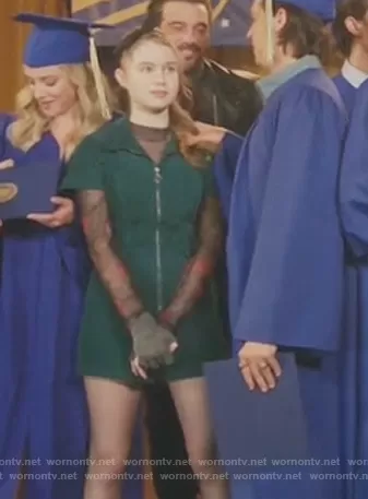 (played by ) on Riverdale on The CW was spotted wearing this green zip front romper on Riverdale on episode 'Graduation' (5x03) in Feb 2021. 's Romper is the Tyson Zip-Front Short Sleeve Romper by Urban Outfitters .