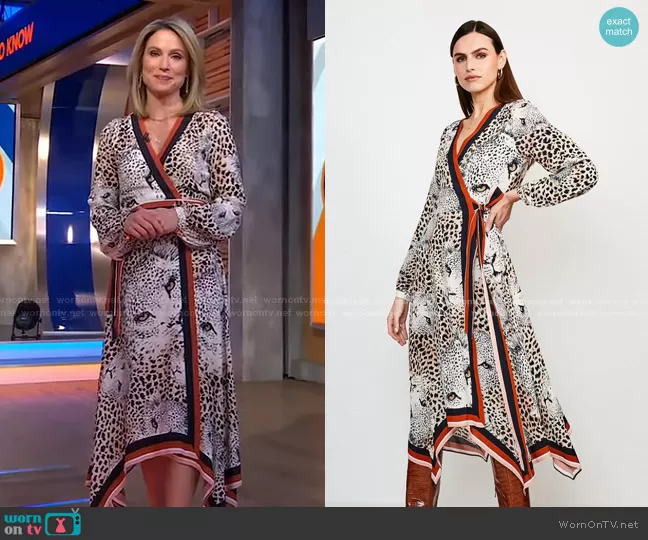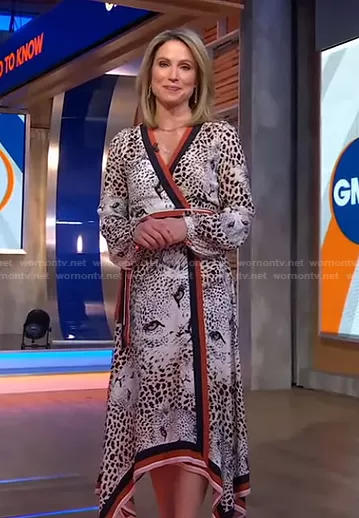 Amy Robach on Good Morning America on ABC was spotted wearing this leopard print wrap dress on Good Morning America on Feb 04 2021's episode. Amy's Dress is the Leopard Border Print Wrap Dress by Karen Millen.