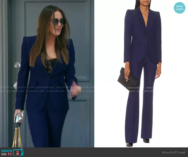 Meredith Marks on The Real Housewives of Salt Lake City on Bravo was spotted wearing this navy blazer and pants on The Real Housewives of Salt Lake City on episode 'Chilly Reception' (1x13) in Feb 2021. Meredith's Jacket is the Single-breasted Crepe Balzer by Alexander McQueen . Meredith's Pants is the Mid-rise Flared Pants by Alexander McQueen.