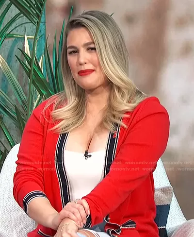 Carissa Loethen Culiner on E! News on E! was spotted wearing this red contrast trim long cardigan on E! News Daily Pop on Feb 05 2021's episode. Carissa's Sweater is the Tinsley Trim Longline Cardigan by L'Agence.