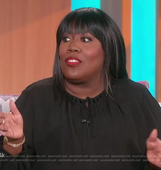 Sheryl Underwood on The Talk on CBS was spotted wearing this black keyhole blouse on The Talk on Feb 05 2021's episode. Sheryl's Top is the Noa Beaded Silk Blouse by Kobi Halperin.