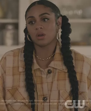 Patience (played by Chelsea Tavares) on All American on CWTV was spotted wearing this yellow plaid jacket on All American on episode 'Seasons Pass' (3x01) in Jan 2021. Patience's Jacket is the James Plaid Jacket by Free People.