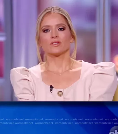 Sara Haines on The View on ABC was spotted wearing this beige puff sleeve jumpsuit on The View on Feb 08 2021's episode. Sara's Jumpsuit is the Cotton Poplin Jumpsuit with Puff Sleeves by En Saison.