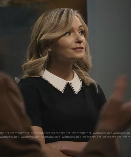 Amy Quinn (played by Lindsey Gort) on All Rise on OWN was spotted wearing this black studded contrast collar shirt on All Rise on episode 'Bette Davis Eyes' (2x08) in Feb 2021. Amy's Top is the Tivola embellished modal and wool-blend jersey top by Maje.