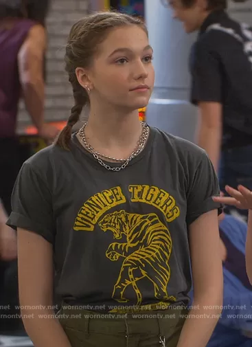 Presley (played by Jayden Bartels) on Side Hustle on Nickeldeon was spotted wearing this black Vince Tigers graphic tee on Side Hustle on episode 'Chemistry Hustle' (1x09) in Feb 2021. Presley's Top is the Venice Tiger Tee by Free People.