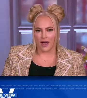 Meghan McCain on The View on ABC was spotted wearing this tweed double breasted blazer on The View on Feb 10 2021's episode. Meghan's Blazer is the Theron Tweed Double-Breasted Jacket by Veronica Beard.