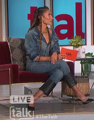 Elaine Welteroth on The Talk on CBS was spotted wearing this denim leather hem jeans on The Talk on Feb 10 2021's episode. Elaine's Pants is the Axl Slim Leather Cuff Jeans by R13.