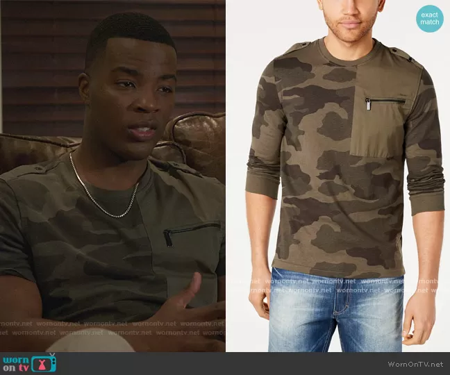 (played by ) on All American on CWTV was spotted wearing this camo print tee on All American on episode 'My Mind's Playing Tricks on Me' (3x04) in Feb 2021. 's Shirt is the Knit Flight Shirt by Sean John.
