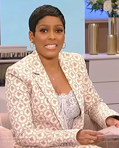 Tamron Hall on Tamron Hall Show on ABC was spotted wearing this floral blazer with lace bustier top on Tamron Hall Show on Feb 11 2021's episode. Tamron's Top is the Strapless grosgrain-trimmed corded lace bustier top by Dolce & Gabbana . Tamron's Blazer is the Quilted cotton-blend floral-jacquard blazer by Paco Rabanne . Tamron's Pants is the Quilted cotton-blend floral-jacquard straight-leg pants by Paco Rabanne.