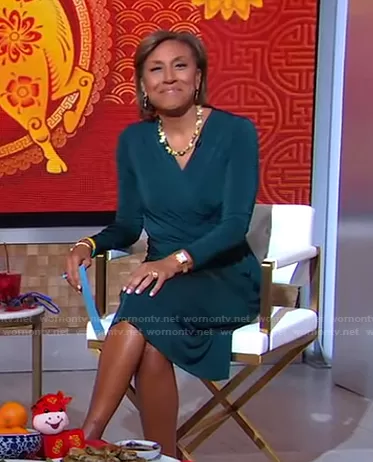 Robin Roberts on Good Morning America on ABC was spotted wearing this green ruched dress on Good Morning America on Feb 11 2021's episode. Robin's Dress is the Ruched Midi Dress by Jason Wu Collection.