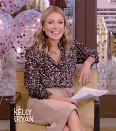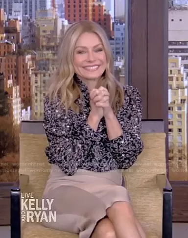 Kelly Ripa on Live with Kelly and Mark on Disney ABC Home Entertainment was spotted wearing this metallic print blouse and beige skirt on Live with Kelly and Ryan on Mar 15 2021's episode. Kelly's Top is the Amelia Metallic Print Blouse by Ba&Sh . Kelly's Skirt is the Bandage Pencil Skirt by Herve Leger . Kelly's Belt is the Valentine Feather-Embellished Velvet Belt by Loeffler Randall.