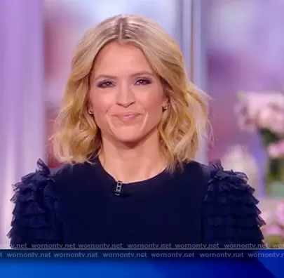 Sara Haines on The View on ABC was spotted wearing this blue ruffle sleeve top on The View on Feb 12 2021's episode. Sara's Top is the Novia Short Sleeve Tee by Sea.