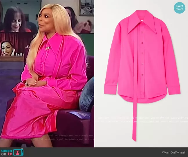 Wendy Williams on The Wendy Williams Show on Various was spotted wearing this tie neck blouse and puff skirt on The Wendy Williams Show on Feb 12 2021's episode. Wendy's Top is the Tie-detailed neon wool-blend shirt by Christopher John Rogers . Wendy's Pants is the Draped silk-taffeta midi skirt by Christopher John Rogers.