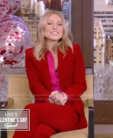 Kelly Ripa on Live with Kelly and Mark on Disney ABC Home Entertainment was spotted wearing this pink shirt and red blazer on Live with Kelly and Ryan on Feb 12 2021's episode. Kelly's Top is the Willow Silk Crepe de Chine Shirt by Stella McCartney . Kelly's Jacket is the Cord Blazer by Saint Laurent . Kelly's Pants is the Cord Flared Pants by Saint Laurent . Kelly's Shoes is the by Gianvito Rossi.