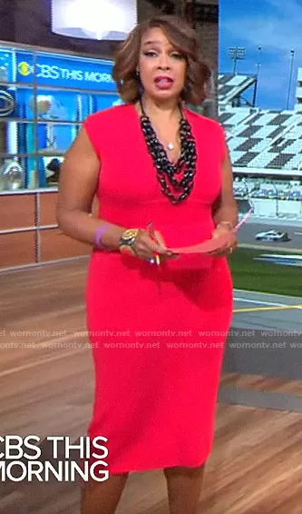 Gayle King on CBS Mornings on CBS was spotted wearing this red v-neck sheath dress on CBS This Morning on Feb 12 2021's episode.