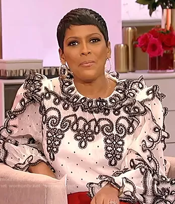 Tamron Hall on Tamron Hall Show on ABC was spotted wearing this white embroidered lace trim blouse on Tamron Hall Show on Feb 12 2021's episode. Tamron's Top is the The Lovestruck Rope embroidered linen and silk-blend organza blouse by Zimmermann.