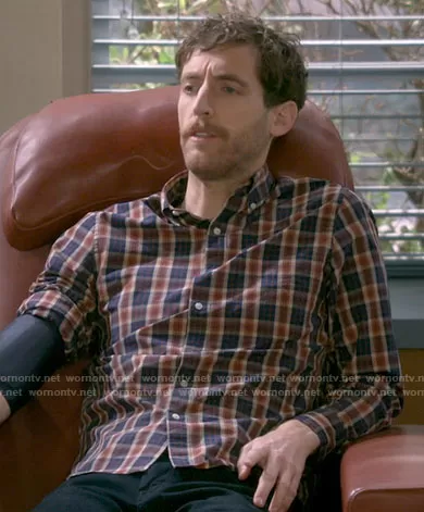 Drew Dunbar (played by Thomas Middleditch) on B Positive on CBS was spotted wearing this navy and orange plaid shirt on B Positive on episode 'Phantom Limb' (1x07) in Apr 2021. Drew's Shirt is the Slim Stretch Secret Wash Cotton Poplin Shirt In Plaid by J. Crew.